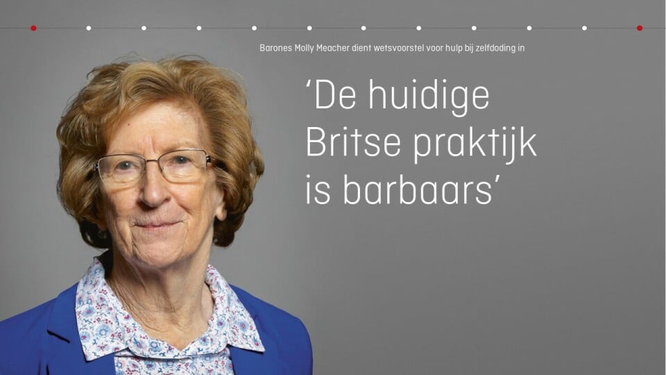In Nederland zat er bijna twintig jaar tussen het eerste voorstel voor een euthanasiewet en de uiteindelijke wet. In Groot-Brittannië wordt al meer dan tachtig jaar gesteggeld over het legaliseren van hulp bij zelfdoding. En zo’n wet is er nog steeds niet. Maar dat duurt niet lang meer, zo is de stellige overtuiging van barones Molly Meacher. ‘Al is euthanasie een stap te ver.’ • Marloes Elings