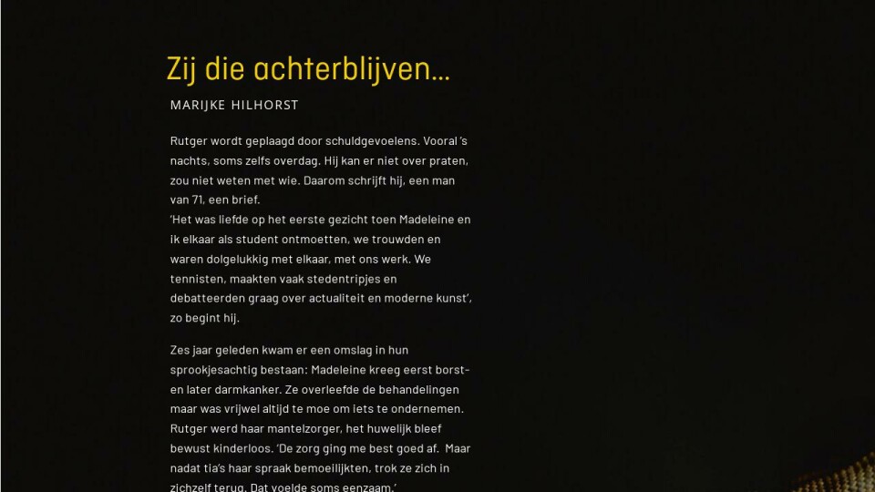 Met een onwaarschijnlijke hernieuwde energie ging Madeleine aan de slag met haar euthanasieverzoek. Rutger stond haar, waar nodig, terzijde. Zeven weken later stierf ze vredig in zijn armen. ‘Intens verdriet, maar geen spijt. Tot voor kort. Ik werd voorgesteld aan een nieuw lid van de tennisclub en dacht direct: wat een leuke vrouw. Die nacht stak de adder van schuld zijn venijnige kop op en sliste dingen als: “Waarom was je zo meegaand? Wilde je heimelijk van haar af?”’