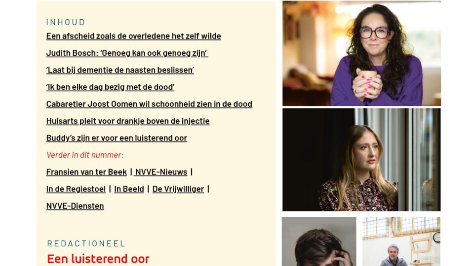 De NVVE kan het niet vaak genoeg zeggen: práát erover! Tegelijkertijd weten we dat veel mensen er moeite mee hebben om hun levenseinde te bespreken met hun naasten. Het komt er niet van, we schuiven het voor ons uit, we zijn er nog te goed of te jong voor… In deze Relevant geven diverse geïnterviewden aan hoe belangrijk het is om er tijdig met je familie over te praten. Maar ook komt aan bod hoe fout het kan lopen als het levenseinde onvoldoende is besproken en vooral als er niet tijdig overeenkomstig de wensen is gehandeld. De moeder van Cyriel Thomas kwam zeer tegen haar wil in een verpleeghuis terecht. Zij had een wilsverklaring, maar toen de dementie eenmaal toesloeg, vond men in het verpleeghuis euthanasie geen optie meer. De echtgenoot van Anneke van der Zanden had helemaal niets geregeld en belandde eveneens tegen zijn zin in een verpleeghuis. Cyriel en Anneke hebben allebei het gevoel dat zij als naaste tekortschoten; zij hebben de wens van hun moeder en echtgenoot niet kunnen verwezenlijken. Zij erkennen dat er meer gesproken had kunnen en moeten worden, dat er meer duidelijkheid had moeten worden verschaft over wanneer het lijden echt te zwaar is geworden. Maar, zo vragen zij zich allebei af, als het eenmaal te laat is, zou de naaste dan geen prominentere rol moeten kunnen spelen? Zou uiteindelijk de beslissing rond wel of geen euthanasie niet bij de naaste moeten liggen?