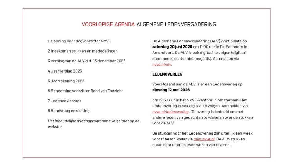 De Algemene Ledenvergadering (ALV) vindt plaats op zaterdag 20 juni 2026 om 11.00 uur in De Eenhoorn in Amersfoort. De ALV is ook digitaal te volgen (digitaal stemmen is echter niet mogelijk). Aanmelden via nvve.nl/alv.