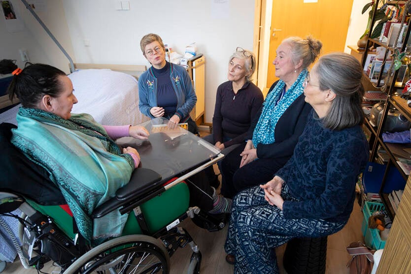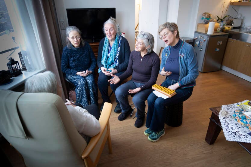 Op de foto’s zijn de Amsterdamse Bedside Singers met Petrie Akkerman (op de foto's met het muziekinstrument) te zien, begin dit jaar op bezoek in verpleeghuis De Klinker in de hoofdstad. Ze zongen die middag op vier kamers, onder meer voor een Jordanese mevrouw, die het Nederlandse repertoire enorm kon waarderen. •