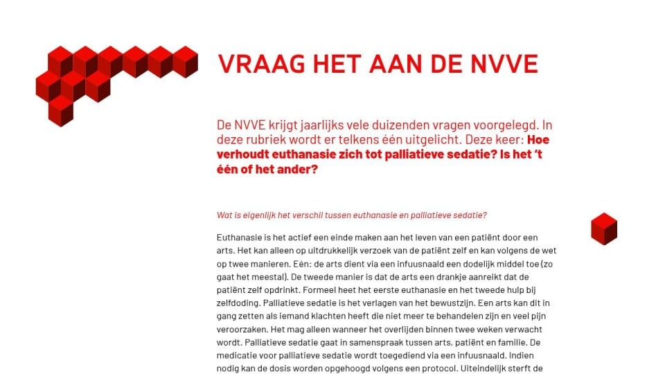 De NVVE krijgt jaarlijks vele duizenden vragen voorgelegd. In deze rubriek wordt er telkens één uitgelicht. Deze keer: Hoe verhoudt euthanasie zich tot palliatieve sedatie? Is het ‘t één of het ander?
