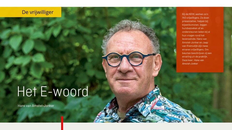 In de politiek werd lange tijd het ‘H-woord’ gebezigd, of juist vermeden. De H stond voor de hypotheekrenteaftrek, die sommige politici niet bespreekbaar wilden maken. Als consulent bij de nvve heb ik ervaren dat er ook zoiets als een ‘E-woord’ bestaat: sommige mensen vinden het lastig om concreet om euthanasie te vragen en doen het dan maar niet.