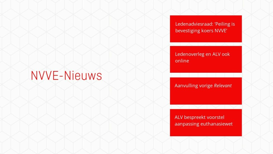 De ledenpeiling werd gehouden onder de ruim tienduizend mensen die deelnemen aan de NVVE-ledenpanels. Zij worden geregeld bevraagd over hun mening met betrekking tot zaken die de nvve aangaan. De meest recente peiling ging over de euthanasiewet die in april twintig jaar bestond. Ook andere hulpverlener De peiling laat drie opvallende uitkomsten zien, vinden de twee Ledenadviesraad-leden. De eerste is dat ruim een derde van de respondenten aangeeft dat speciaal opgeleide hulpverleners mensen zónder medische klachten zouden moeten kunnen helpen bij een waardig sterven. Kroon: ‘De communis opinio tot nu toe is dat een huisarts dit moet doen, vanwege zijn vertrouwensband met de patiënt. Maar als mensen gevraagd wordt te kiezen tussen de huisarts of een speciaal opgeleide hulpverlener, dan geeft een geringe meerderheid de voorkeur aan de hulpverlener. Nog nooit eerder is dit zo duidelijk uit peilingen naar voren gekomen.’ Uit een andere vraag blijkt dat een kwart van de respondenten slechte ervaringen heeft met de afhankelijkheid van de arts bij euthanasie of iemand kent die dat heeft. Volgens de euthanasiewet is de arts de enige die euthanasie mag verlenen, mits aan de zorgvuldigheidseisen is voldaan. Ruim de helft van de respondenten zegt deze afhankelijkheid als een probleem te ervaren. Bijna driekwart onderschrijft de stelling dat iemand die om euthanasie vraagt, te afhankelijk is van de mening van de arts. Kroon: ‘Het groeiende draagvlak voor een andere, gespecialiseerde hulpverlener voor die rol is interessant. De angst voor afhankelijkheid van de arts is een motivatie voor ons om te streven naar aanvullende mogelijkheden. Als Ledenadviesraad willen we daar extra aandacht voor vragen bij het bestuur van de NVVE.’ Wachtlijst Expertisecentrum Samenhangend met deze uitkomsten is de leden nog een tweede uitkomst opgevallen, die heeft betrekking op de wachttijden bij het Expertisecentrum Euthanasie. Die gelden niet alleen voor mensen met complexe euthanasieverzoeken (zoals bij psychiatrische klachten), maar inmiddels ook voor de minder complexe verzoeken. Van de respondenten zegt 4,3 procent zelf op de wachtlijst te staan of iemand in zijn directe omgeving te kennen die dat lot treft. Van de respondenten vindt 92 procent dat de minister zou moeten ingrijpen om de wachtlijsten te verkorten. Kroon: ‘Er is sprake van zo’n grote toeloop dat het Expertisecentrum niet meer de achtervang kan bieden die het voorheen bood. Daarmee dreigt een reserve-optie voor veel mensen te vervallen. Ook hierbij zou de optie van een gespecialiseerde hulpverlener misschien verlichting kunnen bieden.’ Voorzichtigheid De derde uitkomst die de Ledenadviesraad opvallend noemt, is dat 70 procent van de respondenten vindt dat er een door de overheid gereguleerd middel beschikbaar moet komen waarmee mensen zelf hun leven op een waardige manier kunnen beëindigen. Iets meer dan een kwart vindt dat zo’n middel overal, vrij en legaal verkrijgbaar zou moeten zijn. Kroon: ‘Leden zijn dus wel voor een autonome route, maar ze zijn zich kennelijk ook bewust van de risico’s van vrije en legale beschikbaarheid van zo’n middel. Als nvve worden wij er weleens op aangesproken: waarom doen jullie daar toch zo moeilijk over?! Maar in de uitkomsten zien wij dat onze voorzichtigheid door de leden wordt ondersteund. Dat is iets om te koesteren en als Ledenadviesraad zullen we die voorzichtigheid ook zeker bewaken.’•