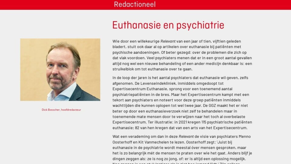 Wie door een willekeurige Relevant van een jaar of tien, vijftien geleden bladert, stuit ook daar al op artikelen over euthanasie bij patiënten met psychische aandoeningen. Of beter gezegd: over de problemen die zich op dat vlak voordoen. Veel psychiaters menen dat er in een groot aantal gevallen altijd nog wel een nieuwe behandeling of een ander medicijn denkbaar is: een struikelblok om tot euthanasie over te gaan.