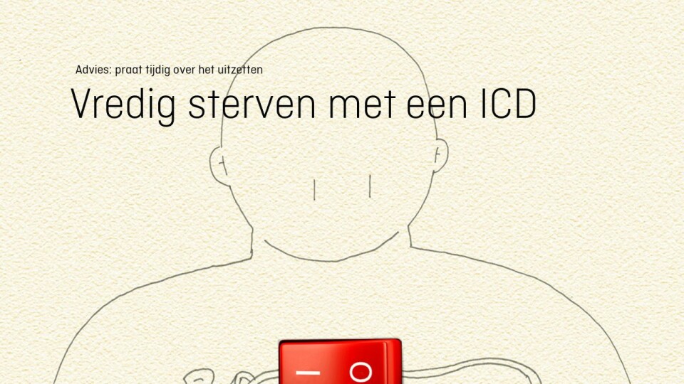 Een ICD is een inwendig apparaatje dat ingrijpt bij gevaarlijke hartritmestoornissen. In eerste instantie probeert een ICD, afkorting voor Implanteerbare Cardioverter Defibrillator, met kleinere elektrische prikkels het normale hartritme te herstellen. Helpt dat niet, dan volgt een grotere shock. Voor dragers – ongeveer 30.000 in Nederland – is het belangrijk om tijdig na te denken over deactivatie, omdat dit apparaatje vredig sterven in de weg kan staan. • Dieuwke de Boer
