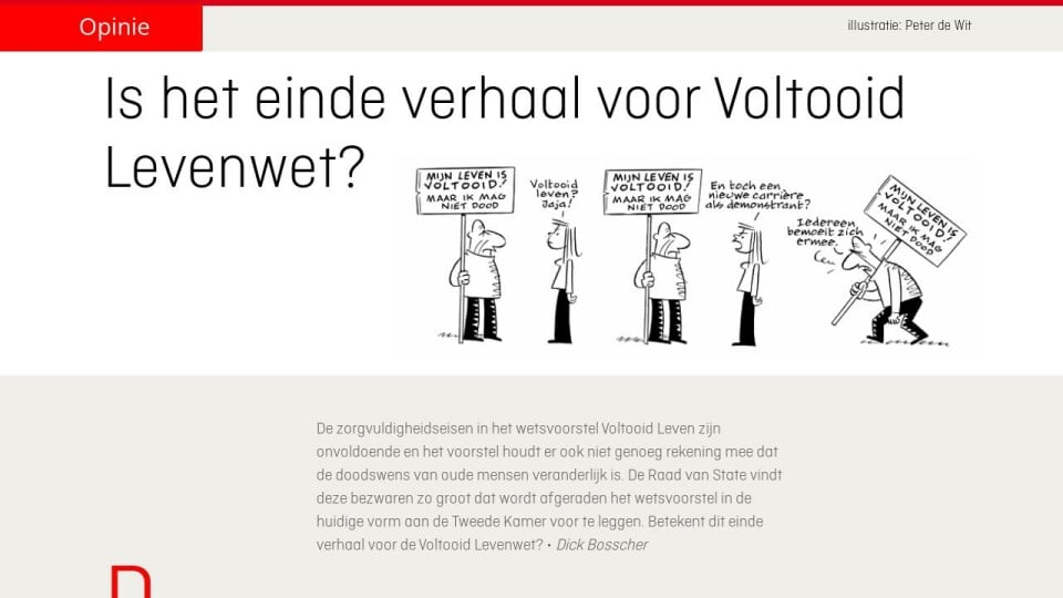 De zorgvuldigheidseisen in het wetsvoorstel Voltooid Leven zijn onvoldoende en het voorstel houdt er ook niet genoeg rekening mee dat de doodswens van oude mensen veranderlijk is. De Raad van State vindt deze bezwaren zo groot dat wordt afgeraden het wetsvoorstel in de huidige vorm aan de Tweede Kamer voor te leggen. Betekent dit einde verhaal voor de Voltooid Levenwet? • Dick Bosscher