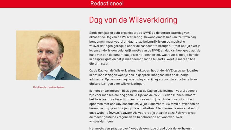 Sinds een jaar of acht organiseert de NVVE op de eerste zaterdag van oktober de Dag van de Wilsverklaring. Gewoon omdat het kan, zelf zo’n dag benoemen, maar vooral omdat het zo belangrijk is om de medische wilsverklaringen geregeld onder de aandacht te brengen. ‘Praat op tijd over je levenseinde’ is een belangrijk motto van de NVVE en dat kan heel goed aan de hand van een document dat je aan het denken zet, waarover je met je familie in gesprek gaat en dat je meeneemt naar de huisarts. Weet je meteen hoe die erin staat.