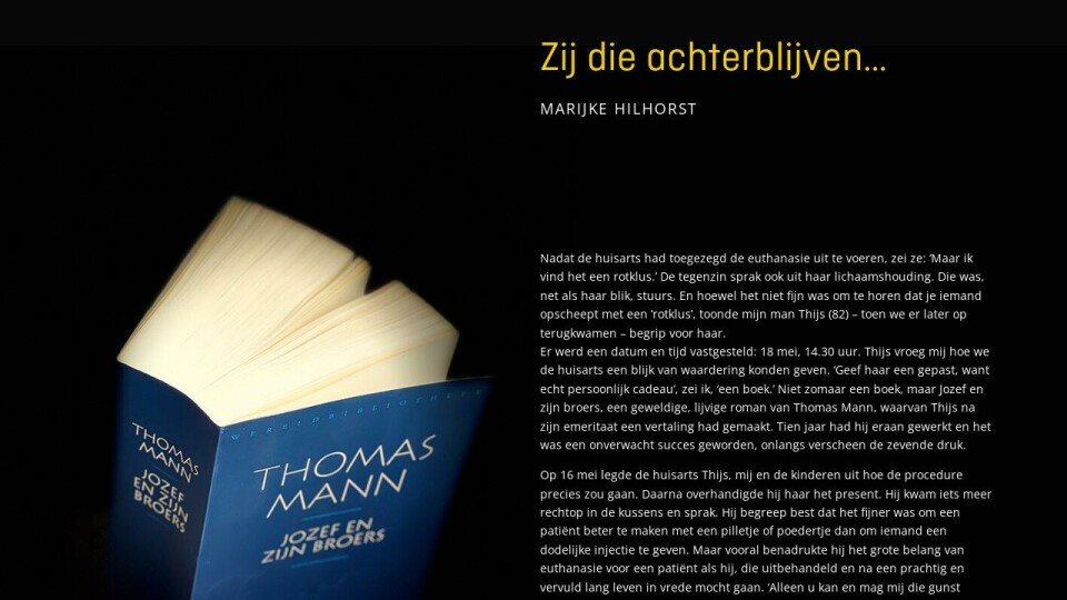 Nadat de huisarts had toegezegd de euthanasie uit te voeren, zei ze: ‘Maar ik vind het een rotklus.’ De tegenzin sprak ook uit haar lichaamshouding. Die was, net als haar blik, stuurs. En hoewel het niet fijn was om te horen dat je iemand opscheept met een ‘rotklus’, toonde mijn man Thijs (82) – toen we er later op terugkwamen – begrip voor haar.