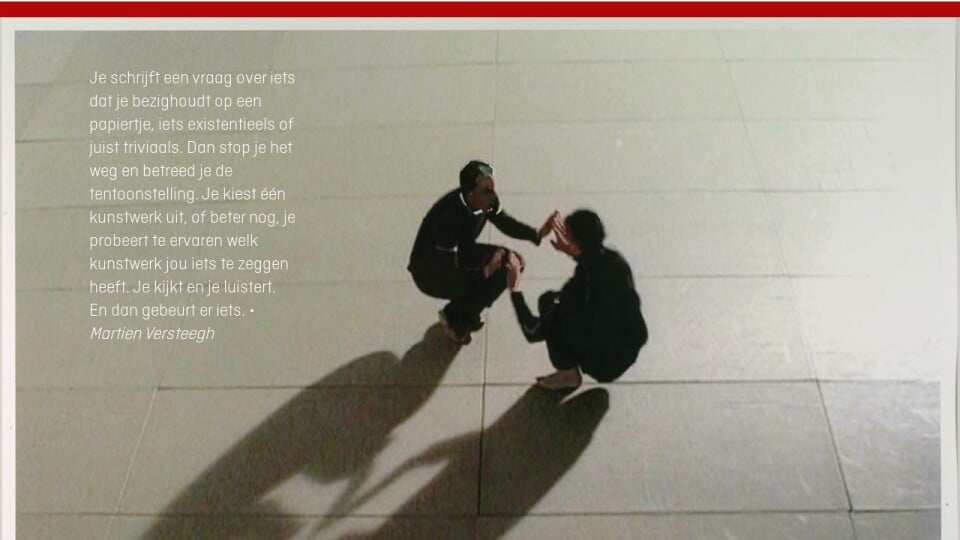 Je schrijft een vraag over iets dat je bezighoudt op een papiertje, iets existentieels of juist triviaals. Dan stop je het weg en betreed je de tentoonstelling. Je kiest één kunstwerk uit, of beter nog, je probeert te ervaren welk kunstwerk jou iets te zeggen heeft. Je kijkt en je luistert.